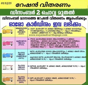 📢2025 ഡിസംബർ മാസത്തെ റേഷൻ വിതരണം 02.12.2025 (ചൊവ്വാഴ്ച) മുതൽ ആരംഭിക്കുന്നതാണ്. 📢2025 ഡിസംബർ മാസത്തിൽ, ലഭ്യതയ്ക്കനുസരിച്ച്, വൈദ്യുതി ഉള്ള വീടുകളിലെ AAY, PHH കാർഡുകൾക്ക് 1 ലിറ്റർ മണ്ണെണ്ണയും, വൈദ്യുതി ഉള്ള വീടുകളിലെ