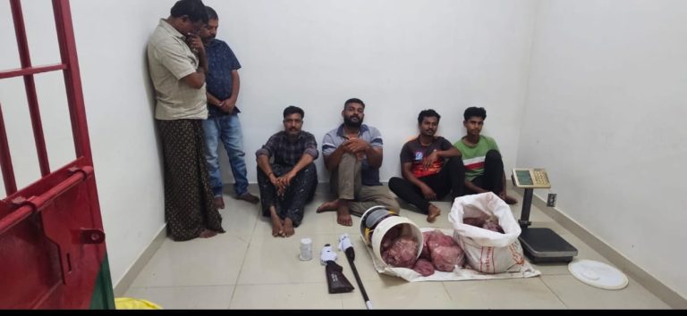 പുൽപ്പള്ളി : ഇരൂളം ഫോറസ്റ്റ് സ്റ്റേഷൻ പരിധിയിലെ കാപ്പി സെറ്റ് ഭാഗത്ത് നിന്നും കാട്ടുപോത്തിനെ വേട്ടയാടിയെ സംഘത്തെ ചെതതലത്ത് റെയിഞ്ച് ഫോറസ്റ്റ് ഓഫീസർ എം കെ രാജീവ് കുമാറിന്റെ നേതൃത്വത്തിൽ പിടികൂടി. സൗത്ത് വയനാട് ഡിവിഷനൽ ഫോറസ്റ്റ് ഓഫീസർ അജിത് കെ രാമന് കിട്ടിയ രഹസ്യ വിവരത്തിന്റെ അടിസ്ഥാനത്തിലാണ് പ്രതികളെ പിടികൂടിയത്. ആറ് പ്രതികളെയാണ് പിടികൂടിയത്. 45 കിലോ ഇറച്ചി ഒരു ഇന്നോവ കാർ ജീപ്പ് സ്കൂട്ടർ ഒരു തിരതോക്ക് കത്തികൾ എന്നിവയും പ്രതികളിൽ നിന്ന് പിടികൂടിയിട്ടുണ്ട്.