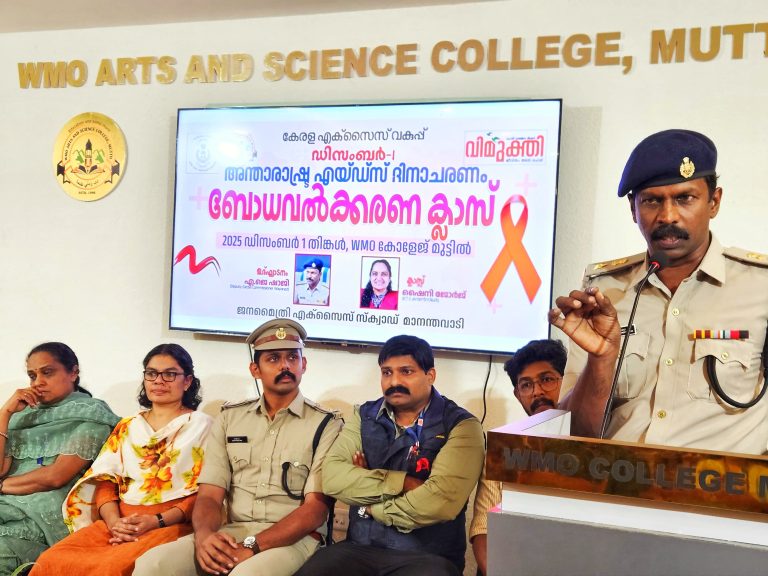 മുട്ടിൽ : ഡിസംബർ 1 അന്താരാഷ്ട്ര എയ്ഡ്സ് ദിനത്തോടനുബന്ധിച്ച് എക്സൈസ് വകുപ്പ് വിമുക്തി മിഷന്റെ നേതൃത്വത്തിൽ കേരള സംസ്ഥാനഎയ്ഡ്സ് കൺട്രോൾ സൊസൈറ്റിയുമായി സഹകരിച്ച് കോളേജ് വിദ്യാർത്ഥികൾക്കായി ശ്രദ്ധ, നേർക്കൂട്ടം കമ്മിറ്റികളുടെ പങ്കാളിത്തത്തോടെ കൂട്ടുചേർന്നുള്ള ലഹരി ഉപയോഗം മൂലം ഉണ്ടാകുന്ന മാരക രോഗങ്ങളെ കുറിച്ചുള്ള ജില്ലാതല ബോധവൽക്കരണ ക്ലാസ് ഡബ്ല്യു.എം.ഒ.ആർട്സ് ആൻഡ് സയൻസ് കോളേജിൽ സംഘടിപ്പിച്ചു. സോഷ്യൽ വർക്ക് ഡിപ്പാർട്ട്മെൻറ് ഹെഡ് എം.എം.അബ്ദുൽ നിസാർ സ്വാഗതം ആശംസിച്ചു. കോളേജ് പ്രിൻസിപ്പൽ ഡോ.വിജി പോൾ അധ്യക്ഷത വഹിച്ചു. വയനാട് ഡെപ്യൂട്ടി എക്സൈസ് കമ്മീഷണർ എ. ജെ.ഷാജി ചടങ്ങ് റെഡ് റിബൺ കാമ്പെയ്ൻ നടത്തി ചടങ്ങ് ഉദ്ഘാടനം ചെയ്യുകയും, “ഭയമല്ല അവബോധമാണ് ആവശ്യമെന്നും, നൈമിഷിക സന്തോഷത്തിന്റെ പുറകെ പോവാതെ ചെറുപ്പത്തിലെ പോസിറ്റീവ് ലഹരികൾ ശീലമാക്കാൻ വിദ്യാർത്ഥികളോട് ആവശ്യപ്പെട്ടു”.ഐ.സി.ടി.സി കൗൺസിലർ ഷൈനി ജോർജ്ജ് എയ്ഡ്സ് ദിന ബോധവൽക്കരണ ക്ലാസ് നയിച്ചു. വിമുക്തി മിഷൻ വയനാട് ജില്ല കോഡിനേറ്റർ എൻ.സി.സജിത്ത്കുമാർ അച്ചൂരാനം ആശംസകൾ അർപ്പിച്ച് സംസാരിച്ചു.എക്സൈസ് ഇൻസ്പെക്ടർ യു.കെ.ജിതിൻ നന്ദി പ്രകാശനം നടത്തി. അസിസ്റ്റൻറ് എക്സൈസ് ഇൻസ്പെക്ടർ കെ.കെ.ബാബു സംബന്ധിച്ചു.