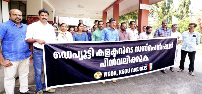 കൽപ്പറ്റ:- ജീവനക്കാരുടെ മനോവീര്യം നഷ്ടപ്പെടുത്തുന്ന രാഷ്ട്രീയ പ്രേരിതമായിട്ടുള്ള നടപടികൾ ഉടൻ അവസാനിപ്പിക്കണമെന്നും, സത്യസന്ധമായി ജോലി ചെയ്ത് നടപടി നേരിട്ട ഡെപ്യൂട്ടി കലക്ടറുടെ സസ്പെൻഷൻ പിൻവലിക്കണമെന്നും കേരള ഗസറ്റഡ് ഓഫീസേഴ്സ് യൂണിയൻ ആവശ്യപെട്ടു. സസ്പെൻഷനിൽ പ്രതിഷേധിച്ചുകൊണ്ട് ജീവനക്കാർ കളക്ട്രേറ്റിൽ പ്രതിഷേധ പ്രകടനവും ധർണയും നടത്തി. പ്രതിഷേധയോഗം കെജിഒയു ജില്ലാ പ്രസിഡണ്ട് സഫ് വാൻ ഉദ്ഘാടനം ചെയ്തു. കേരള എൻജിഒ അസോസിയേഷൻ ജില്ലാ പ്രസിഡണ്ട് കെ ടി ഷാജി മുഖ്യപ്രഭാക്ഷണം നടത്തി . ഇ എസ് ബെന്നി, സന്ദേശ് സി ബി, വി.ആർ ജയപ്രകാശ്, സി കെ ജിതേഷ്, എൻ ജെ ഷിബു, ലൈജു ചാക്കോ,എ അജീർ, എം. നസീമ,എൻ അയ്യപ്പൻ എന്നി വർ സംസാരിച്ചു.